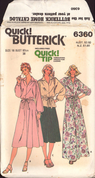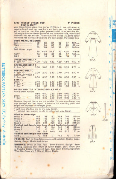 Very loose fitting dress five inches (12.5 cm) below mid-knee or evening length and top have front and back gathered into shaped self or contrast shoulder yoke, pointed collar, front neckline slit, full length dolman sleeves gathered into buttoned cuffs, elasticized waistline and self tie belt. Flared skirt five inches (12.5 cm) below mid-knee has elasticized waistline and back zipper.