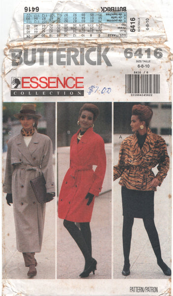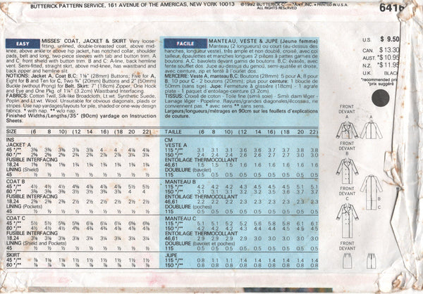 Very loose-fitting, unlined, double-breasted coat, above mid-knee, above ankle or above hip jacket, has notched collar, shoulder pads, belt and long, two-piece sleeves with tab and button trim. A and C: front shield with button trim. B and C: A-line, back hemline vent. Semi-fitted, straight skirt, above mid-knee, has waistband and back zipper and hemline slit.