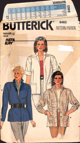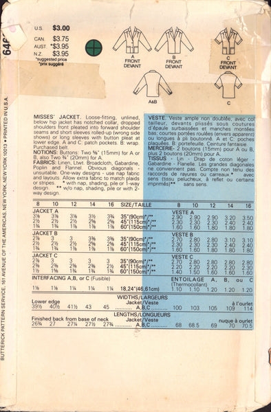 Loose-fitting, unlined below hip jacket has notched collar, dropped shoulders front pleated into forward shoulder seams and short sleeves rolled-up (wrong side shows) or long sleeves with button pleat at lower edge. A and C patch pockets. B: wrap. Purchased belt.