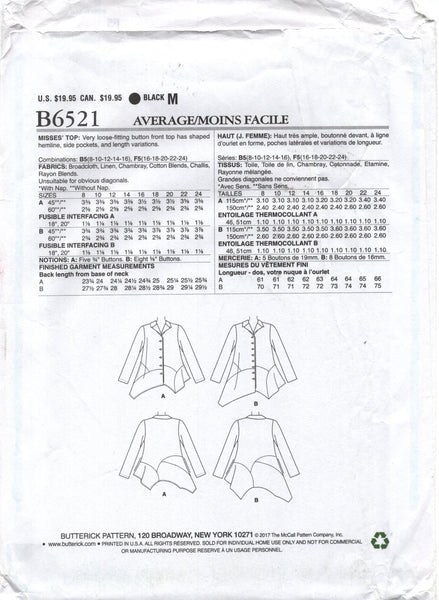 Very loose fitting button front top has shaped hemline, side pockets, and length variations.