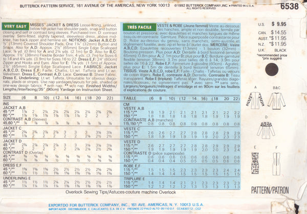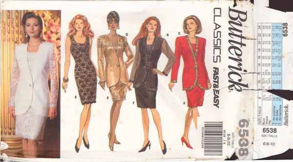Butterick 6538 Sewing Pattern, Misses' Jacket, Dress, Size 6-8-10, Uncut, Factory Folded
