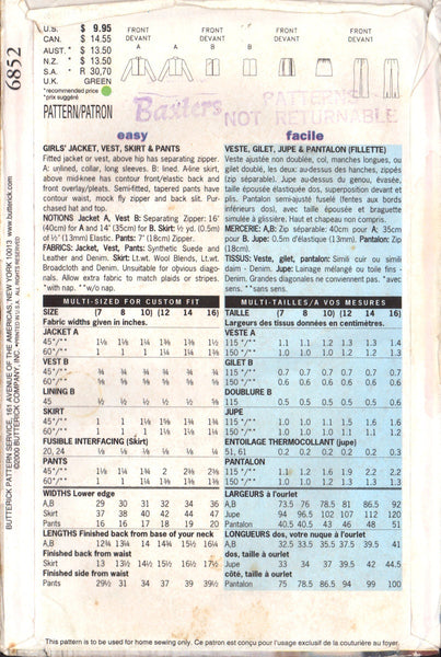Butterick 6852 Sewing Pattern Girl's Jacket Vest Pants Skirt Size 7-8-10 Uncut Factory Folded
