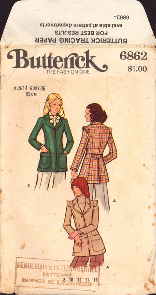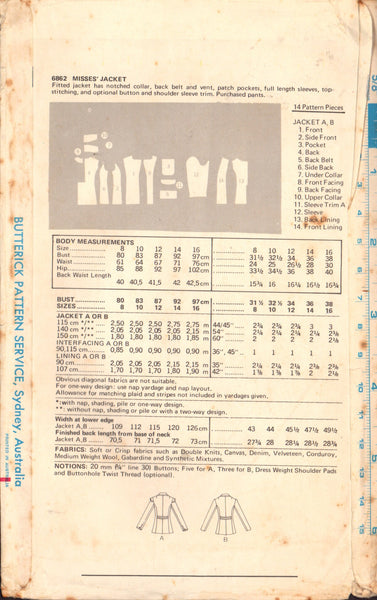 Fitted jacket has notched collar, back belt and vent, patch pockets, full length sleeves, top-stitching, and optional button and shoulder sleeve trim. Purchased pants.