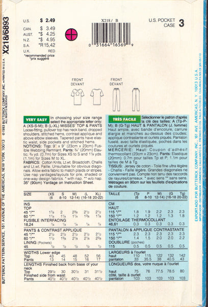Butterick 6893 Sewing Pattern Top & Pants Size L-XL Uncut Factory Folded