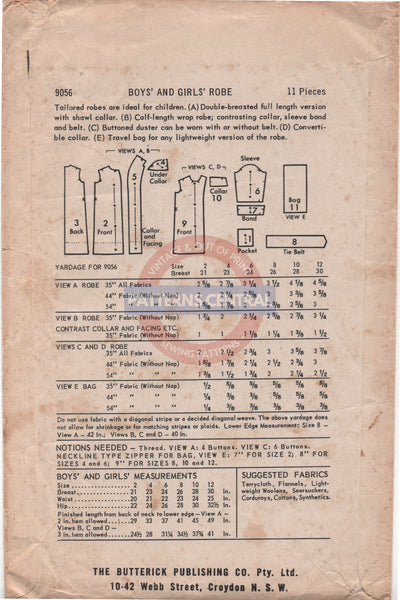 Tailored robes are ideal for children. (A) Double breasted full length version with shawl collar. (B) Calf- length wrap robe; contrasting collar, sleeve band and belt. (C)Buttoned duster can be worn with or without belt. (D) convertible collar. (E) Travel bag for any light weight version of the robe.