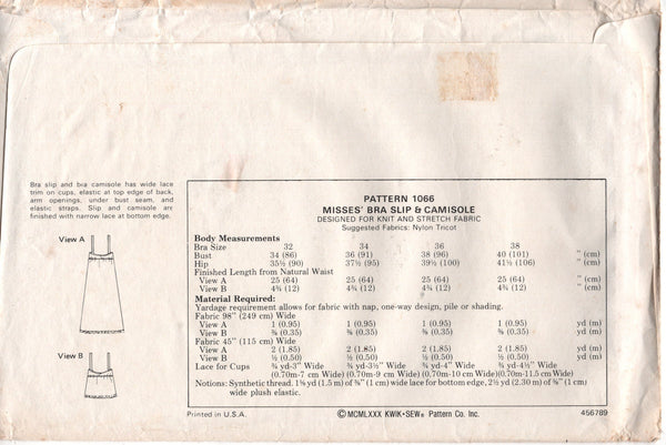 Bra slip and bra camisole has wide lace trim on cups, elastic at top edge of back, arm openings, under bust seam, and elastic straps. Slip and camisole are finished with narrow lace at bottom edge.