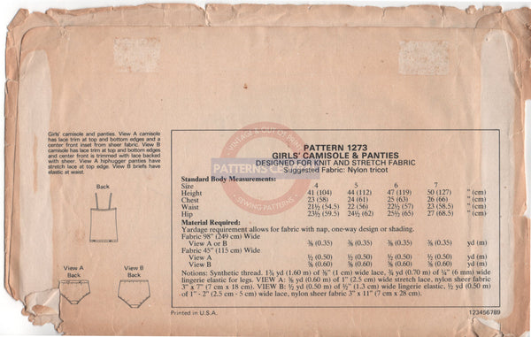 View A camisole has lace trim at top and bottom edges and a center front inset from sheer fabric. View B camisole has lace trim at top and bottom edges and center front is trimmed with lace backed with sheer. View A hiphugger panties have stretch lace at top edge. View B briefs have elastic at waist.