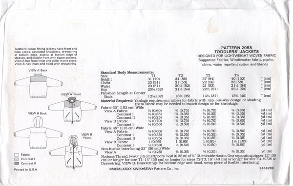 Jackets have front and back yokes, extended shoulders, drawstring at bottom edge, elastic at bottom edge of sleeves, and double front with zipper opening and zipper pockets. View A has front inset and collar in one piece. View has B inset and hood with drawstring.