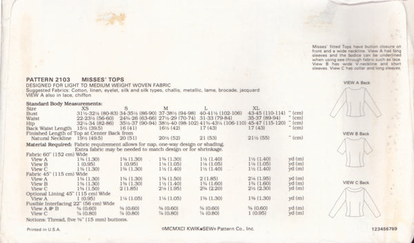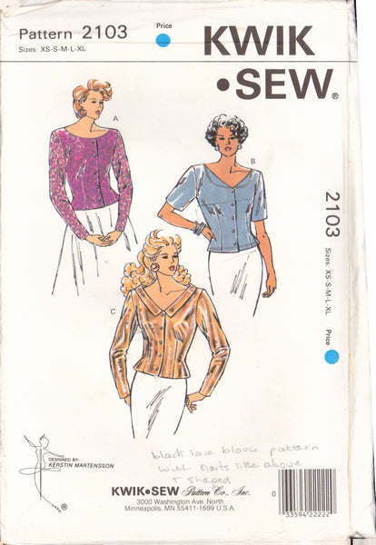 Kwik Sew 2103 Sewing Pattern, Misses' Top, Size XS-S-M-L-XL, Cut Apart, Complete