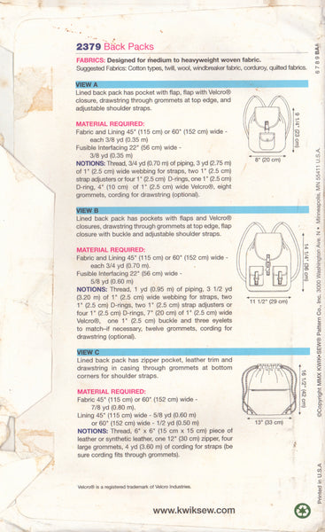 Kwik Sew 2379 Sewing Pattern, Back Packs, One Size, Partially Cut, Incomplete