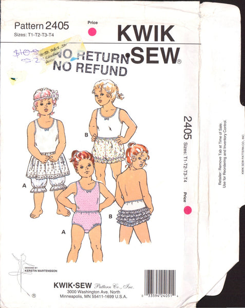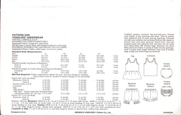 Panties have elastic at the leg openings and waist. View B panties have gathered lace on the back and at the leg openings. Camisole and slip have neckline and armholes finished with elastic or stretch lace and have an optional ribbon bow. Slip has a dropped waist and gathered skirt, and the skirt can be made from eyelet fabric with a finished edge. Bloomers are loose fitting and have elastic in casing at the waist and leg openings. View A below the knee length bloomers have lace at the bottom edge of the legs and View B legs are hemmed.