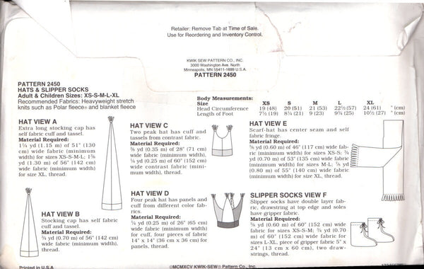 View D is a four peak hat. All of the panels and the cuff are made from different colour fabrics. View E scarf-hat has a center seam and self fabric fringe. View F Slipper Socks.