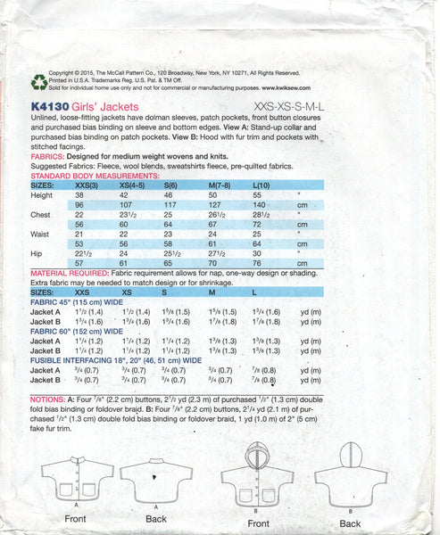 Unlined, loose fitting jackets have dolman sleeves, patch pockets, front button closures and purchased bias binding on sleeve and bottom edges. View A: Stand-up collar and purchased bias binding on patch pockets. View B: Hood with fur trim and pockets with stitched facings.