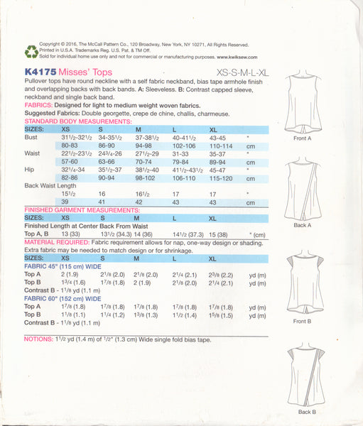 Kwik Sew 4175 Sewing Pattern, Misses' Tops, Size XS-S-M-L-XL, Uncut, Factory Folded