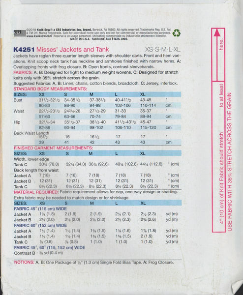 Kwik Sew 4251 Sewing Pattern, Women's Jackets and Tank Top, Size XS-XL, Uncut, Factory Folded