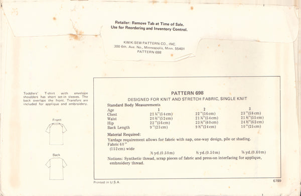 Kwik Sew 698 Sewing Pattern Toddlers' T-Shirt Age 1-2-3, Uncut Factory Folded
