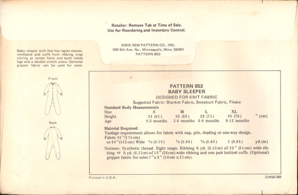 Baby sleeper with feet has raglan sleeves, neckband an cuffs from ribbing, snap clsoing at center front and both inside legs and a double crotch piece. Optional gripper fabric can be used for soles.