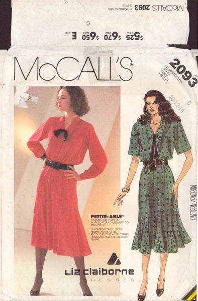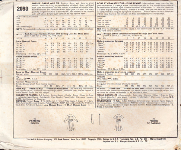 McCall's 2093 Sewing Pattern, Misses' Dress and Tie, Size 10-12-14, Cut, Complete