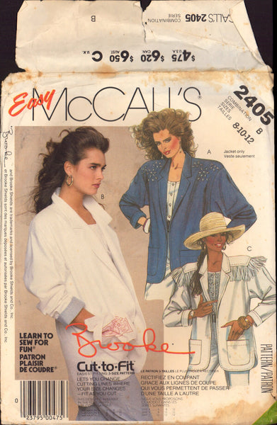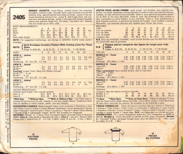 Loose-fitting, unlined jacket has extended shoulders, notched collar, shoulder pads, patch pockets and shirttail hemline; long, tapered sleeves have deep armholes. Jacket A has optional rhinestone and stud trim. Jacket B, with longer back, has contrast hem and sleeve facings. Jacket C has yoke with forward shoulder seams and optional fringe trim. All views: Top-stitch trim. Sleeves may be turned up to form cuffs.