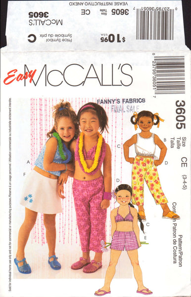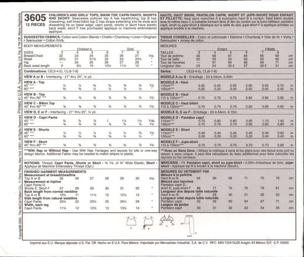 Sleeveless pullover top A has topstitching; top B has drawstring; self-lined bikini top C has straps extending into tie ends and drawstring tie on lower edge; capri pants, shorts or skort have elastic back waist; skort F has purchased applique or machine embroidered applique.