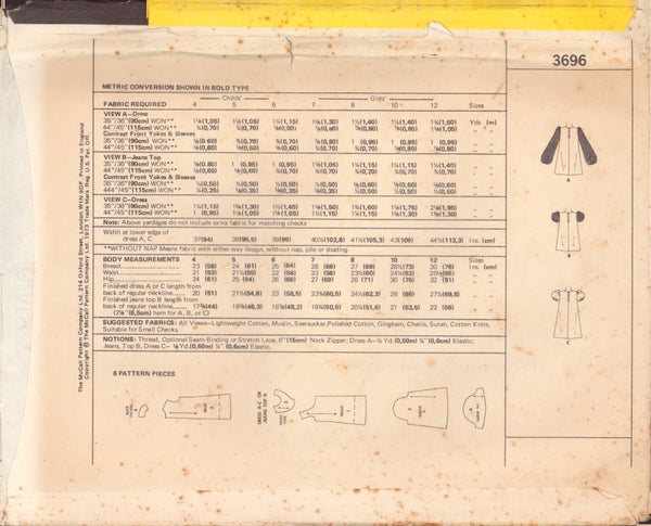 McCall's 3696 Sewing Pattern, Girls' Dress and Top, Size 6, Cut, Complete