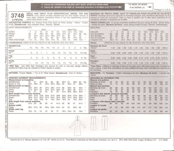 Long sleeved hooded sweatercoat has front button closure at neck edge; pullover sleeveless dress or top has top stitching; pull-on pants have elastic waist.