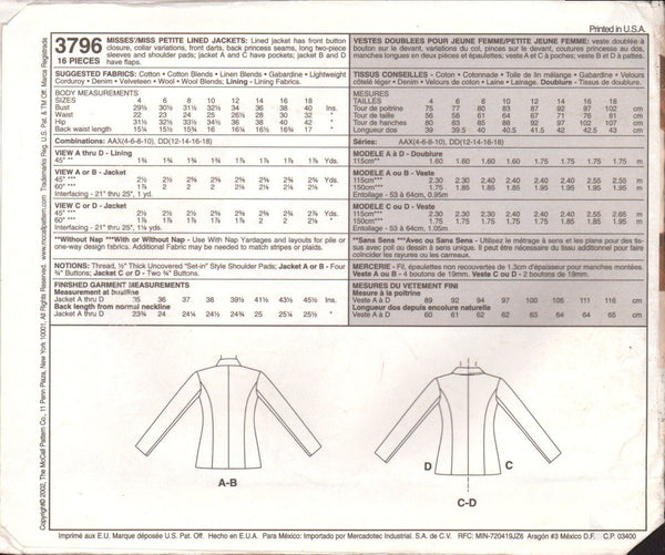 Lined jacket has front button closure, collar variations front darts, back princess seams, long two piece sleeves with shoulder pads. Jacket A and C have pockets. Jacket B and D have flaps.