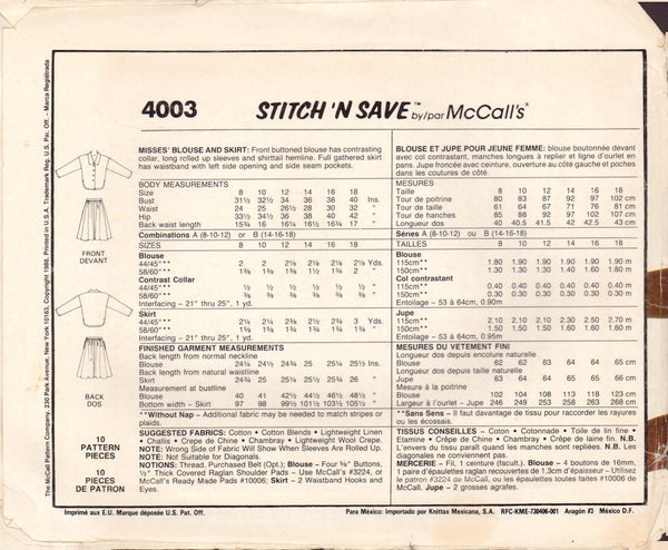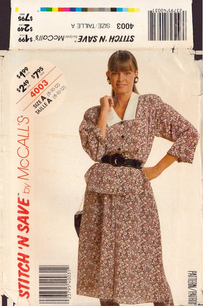 McCall's 4003 Sewing Pattern, Blouse and Skirt, Size 8-10-12, Uncut, Factory Folded