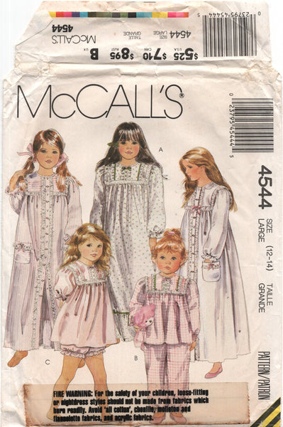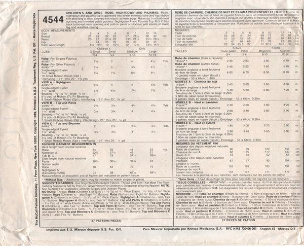 Robe, nightgown and pajama top is gathered into eyelet trimmed yoke and has ribbon trim and long or short sleeves with elastic at lower edge. Robe has front buttoned opening and trimmed patch pockets. Nightgown A and Pajama Top B or C has back buttoned neck opening and pull-on pants or bloomer with elastic at lower leg and waistline casing.