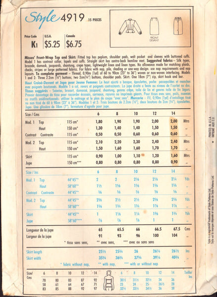 Style 4919 Sewing Pattern, Front-Wrap Top and Skirt, Size 10-12-14, CUT, COMPLETE