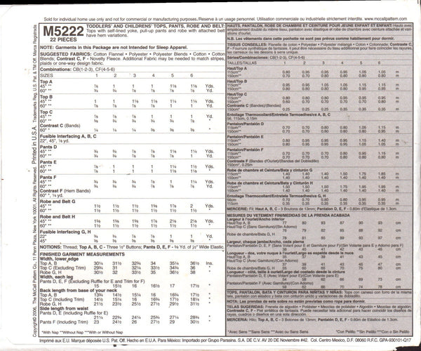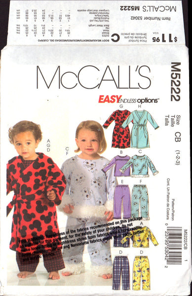 McCalls 5222 Sewing Pattern Children's Tops Pants Robe Belt Size 1-2-3 or Size 4-5-6, Uncut, Factory Folded