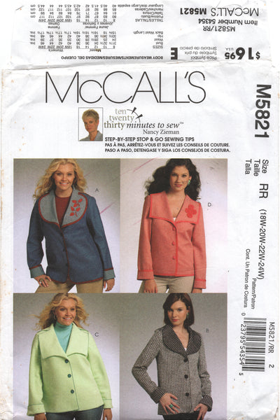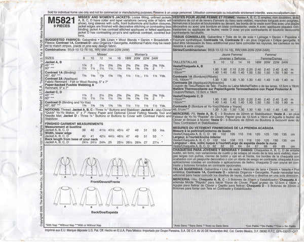 Loose fitting, unlined jackets A, B, C, D have collar and lapel variations (wrong side of fabric will show), long sleeves with cuffs, front buttonhole and button closures, jacket edges are finished with decorative stitching or contrasting bias binding; jacket A has contrast stitched appliques or felted appliques; jacket D has contrasting yo-yo's and optional contrast, covered buttons.