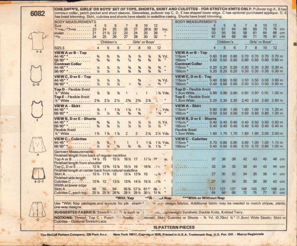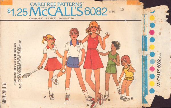 McCall's 6082 Sewing Pattern, Children's Tops, Shorts, Skirts, Culottes, Size 10, Partially Cut, Complete