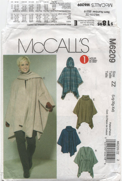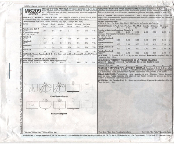 Oversized ponchos A, B, C, D, E have topstitch trim and shaped hemline; poncho A has belt; ponchos B, C have collar with tie ends; poncho D has hood and fringe trim; poncho E has collar.