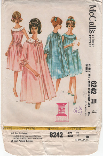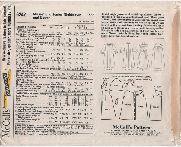 Yoked nightgown and matching duster. Gown is gathered to faced yoke at back and front. Sheer gown is lined, has lace edging in yoke seams, bound armholes. Yoke and armholes of non-sheer gown are bound with contrast bias binding. Duster has set in sleeves with elastic sewn underneath forming ruffles. Pockets in side seams, shirring at front and back of neck. Sheer duster is lined, has faced collar. Non-sheer duster has bound neckline.
