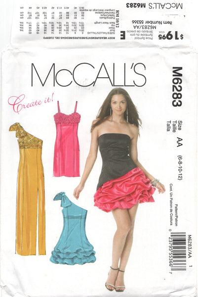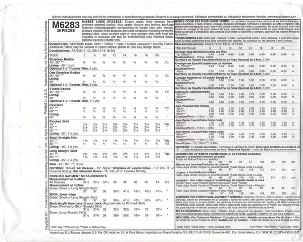 Empire waist, lined dresses have princess seamed bodice, side zipper closure and boning; package features interchangeable components to create your own design; choices include three bodices and skirt variations including overskirt, pinched skirt, short straight skirt or long straight skirt with front slit; included in package are tips for embellishing your finished dress; optional raveled rosette trim.