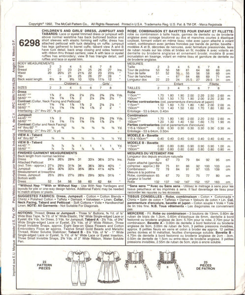 McCall's 6298 Kitty Benton Gourmet Sewing: Girls' Dress, Jumpsuit and Tabards, Uncut, Factory Folded Sewing Pattern Size 7