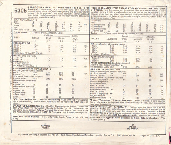 McCall's 6305 Sewing Pattern, Children's and Boys' Robe With Tie Belt and Pajamas, Size Med-Lrg, Cut, Complete