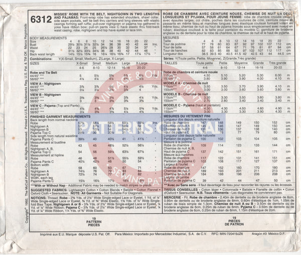 Front-wrap robe has extended shoulders, shawl collar, side seam pockets, self tie belt thru carriers and long sleeves with elastic casings forming self ruffle; pull-over nightgown or pajama top gathered to yoke have ribbon bow; pull-on pants view C have elastic thru fold-back waist casing; robe, nightgown and top have eyelet or lace trim.