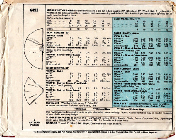 Flared skirts A and B are cut in two lengths, 27" (69 cm) and 30" (76 cm). Skirt A, gathered into waistband has side seam pockets, zipper in back seam opening and tie ends. Skirt B with zipper in side seam opening can be made from border print fabric.
