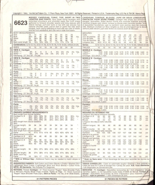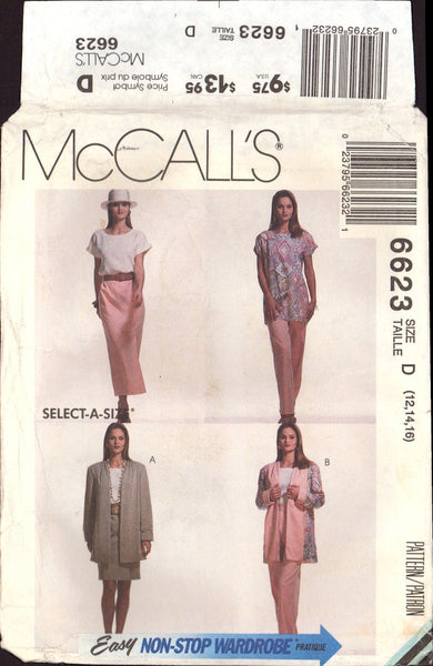 McCall's 6623 Sewing Pattern Women's Pants, Tunic Top, Skirt, Cardigan 12-14-16 Uncut Factory Folded