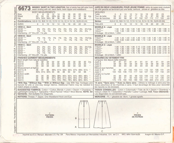 McCall's 6673 Sewing Pattern, Skirts, Size 14-16-18, Uncut, Factory Folded