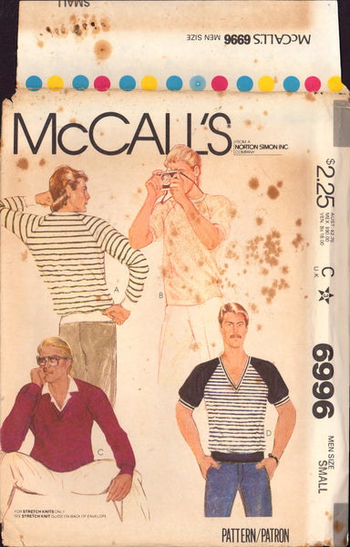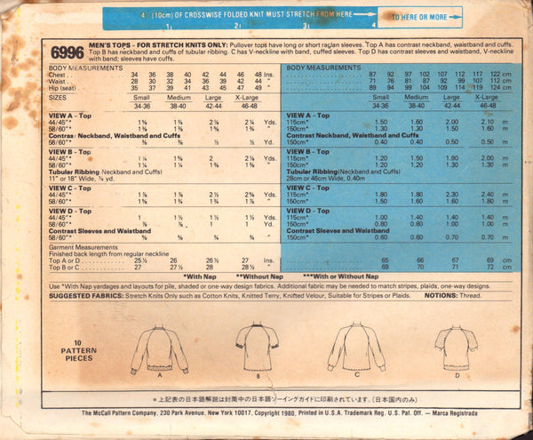Pullover tops, have long or short raglan sleeves. Top A has contrast neckband, waistband and cuffs. Top B has neckband and cuffs of tubular ribbing. C has V-neckline with band, cuffed sleeves. Top D has contrast sleeves and waistband, V-neckline with band, sleeves have cuffs.