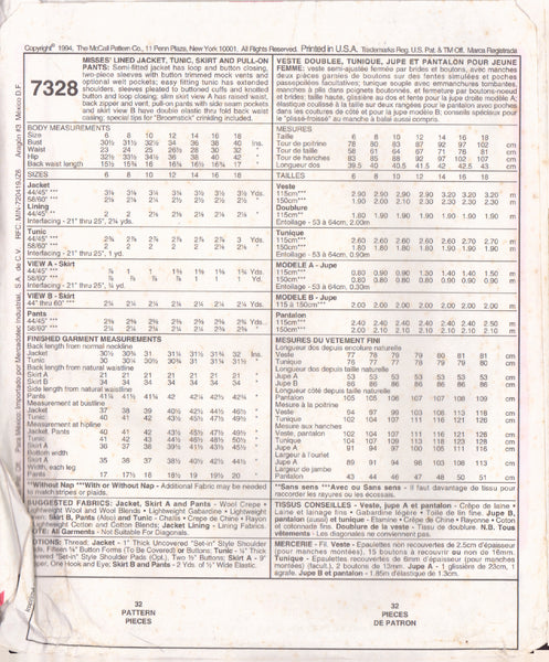 McCall's 7328 Sewing Pattern, Jacket, Tunic, Skirt & Pants, Size 14, Uncut, Factory Folded