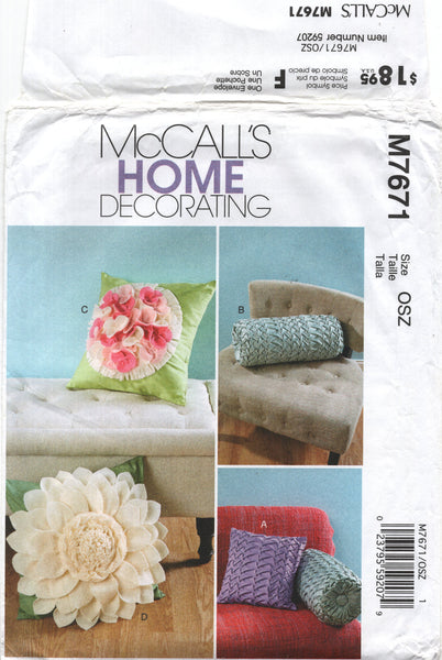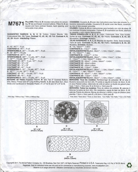 Pillow A, B includes instructions for smocking. View B has purchased covered buttons. Pillow C, D are square and have contrast flowers, back opening and removable inner pillow.