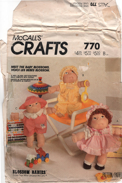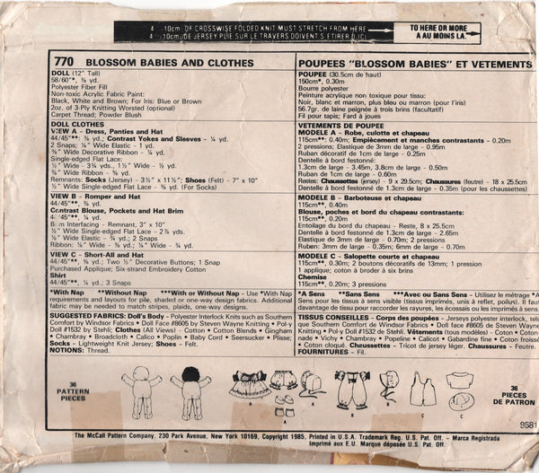 Pattern and instructions to create 12" (30.5 cm) tall Blossom Baby doll and clothing.