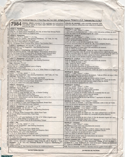 Included in this package are instructions and pattern pieces to make eight different veil headpieces and one hat view.