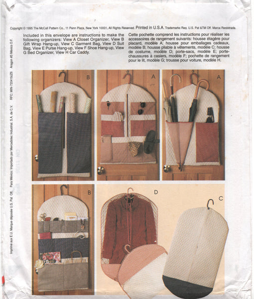 Included in this envelope are instructions to make the following organizers: A: Closet Organizer B: Gift Wrap Hang-Up C: Garment Bag D: Suit Bag E: Purse Hang-Up F: Shoe Hang-Up G: Bed Organizer H: Car Caddy.
