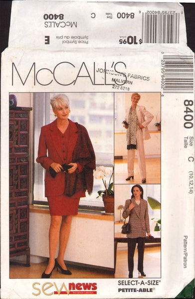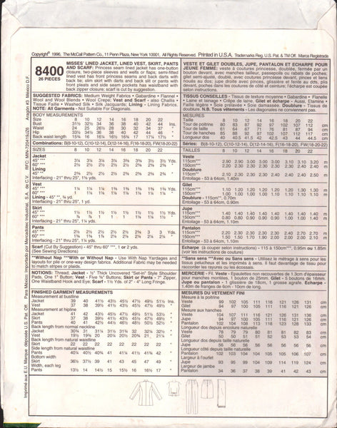 Princess seam lined jacket has one-button closure, two-piece sleeves and welts or flaps, semi-fitted lined vest has front princess seams and back darts with back tie; slim skirt with darts and back slit or pants with front pleats and side seam pockets has waistband with back zipper closure; scarf is cut by suggestion.