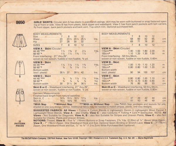 McCall's 8650 Sewing Pattern, Skirts, Size 7, Cut, Complete